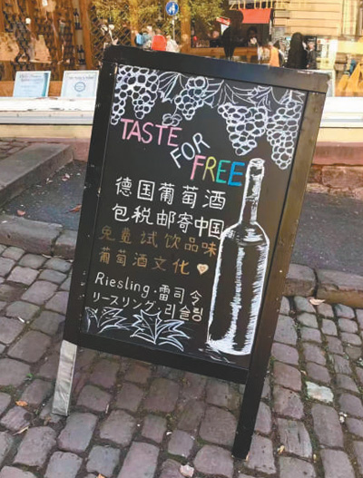 德國(guó)法蘭克福,當(dāng)?shù)仄咸丫粕掏瞥隽酥形膹V告牌。記者 李強(qiáng)攝