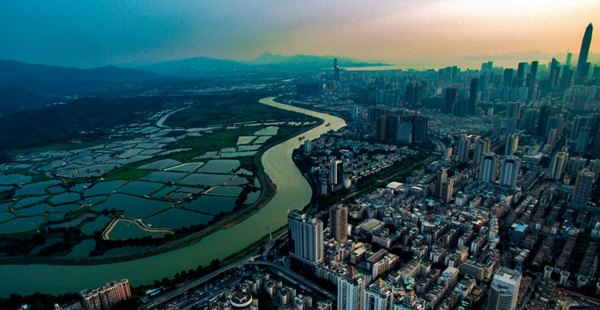 無人機拍攝的深圳和香港落馬洲河套地區(qū)及周邊風光(2018年5月23日攝)。新華社記者 毛思倩 攝