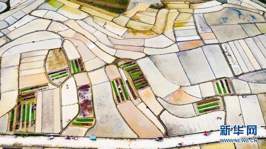 3月24日,廣西河池市東蘭縣武篆鎮色故村農民在田間勞作(無人機照片)。