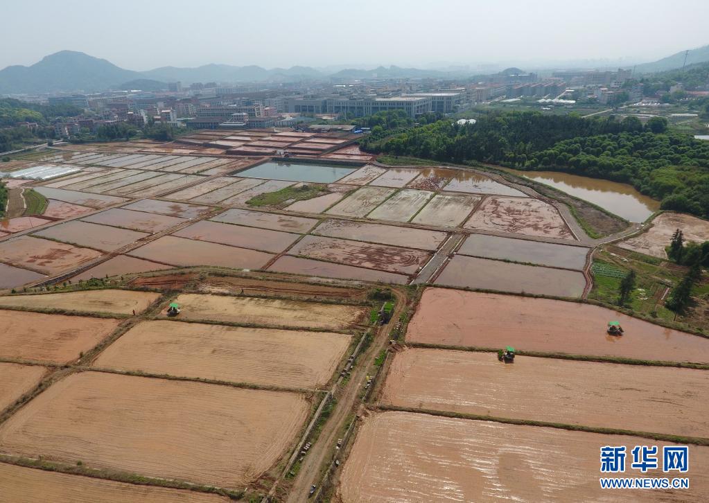 4月6日,浙江省金華市武義縣白洋街道沈宅村農民駕駛農機在田間插種早稻(無人機照片)。