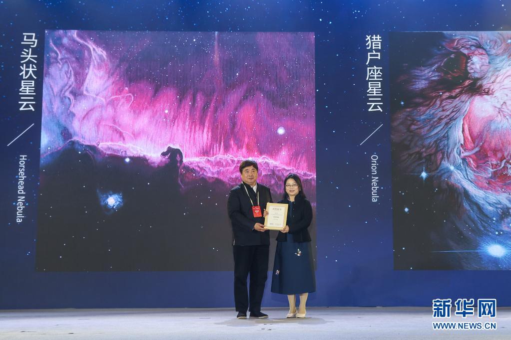 4月24日,在江蘇南京中國航天日主場活動(dòng)現(xiàn)場,陳英華(右)的“星空”系列蘇繡作品獲得太空探索與藝術(shù)創(chuàng)想大賽特別獎(jiǎng)。新華社發(fā)(崔曉 攝)