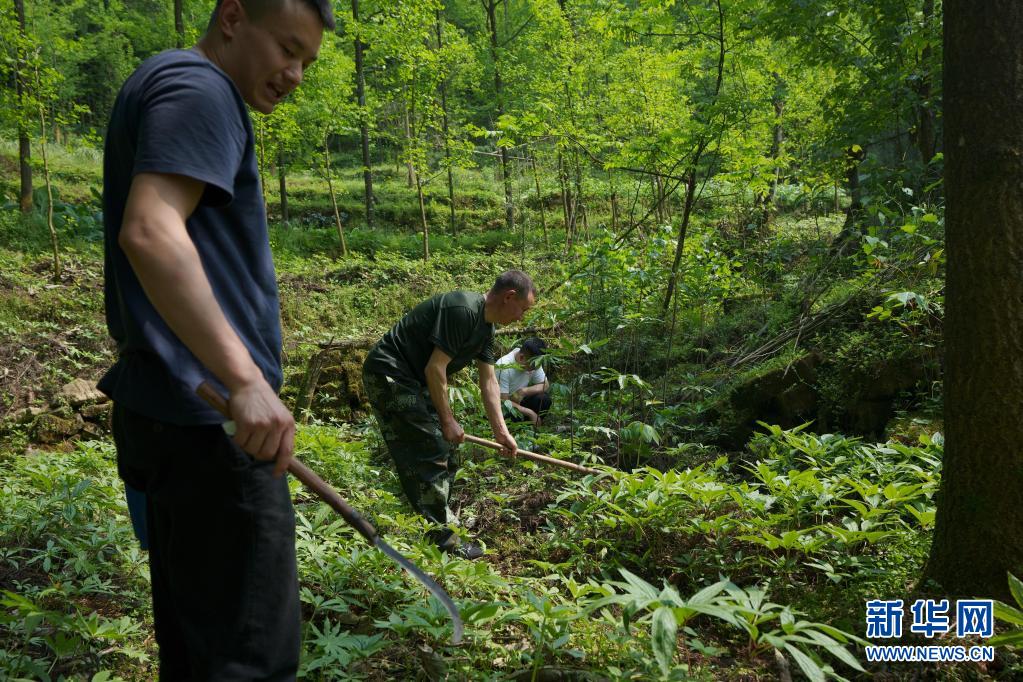 5月4日,林興聰(中)和兒子林順坪(左)、女婿劉永鋒為地里種植的藥材除雜草。 新華社記者 江宏景 攝