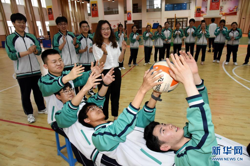 5月23日,青島通濟實驗學校高三學生在進行“躺椅傳球”游戲。
