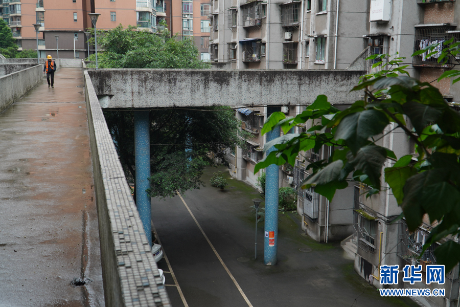 據了解,該小區位于重慶市渝中區長江二路。通過這個空中走廊,居民可以直接走到和天橋齊平的街道上去。新華網 耿駿宇 攝