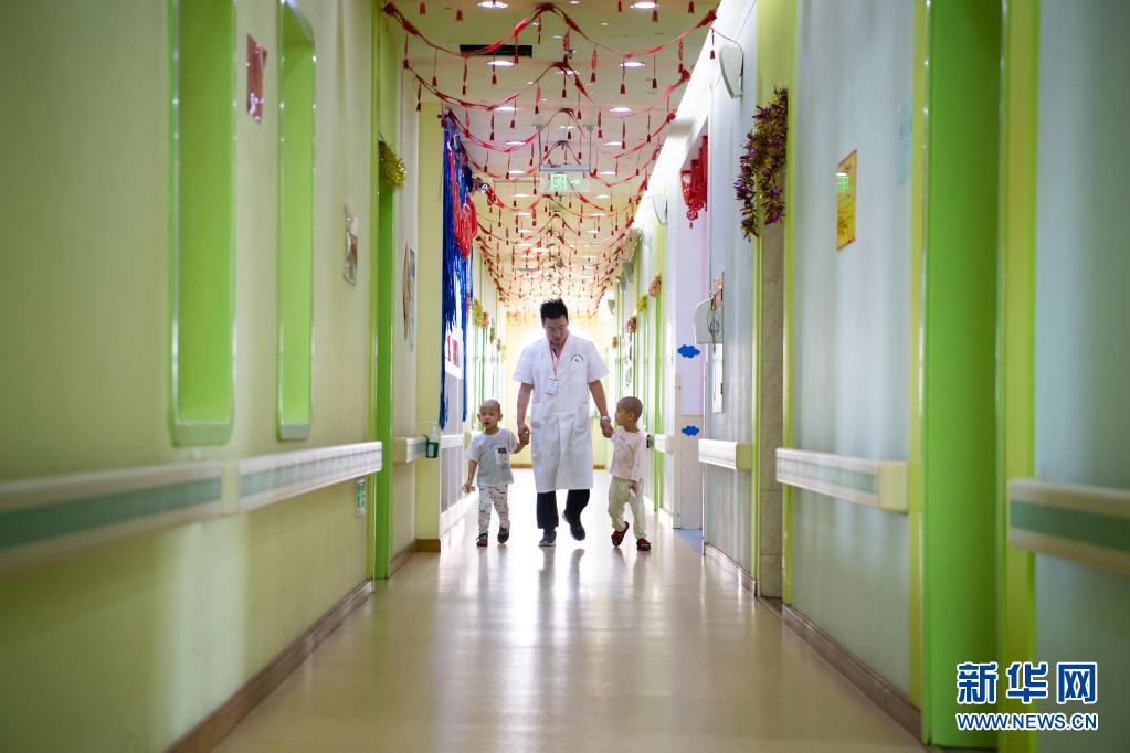 在太原市社會(huì)(兒童)福利院,黨龍祥帶孩子們在樓道散步(5月26日攝)。新華社記者 楊晨光 攝