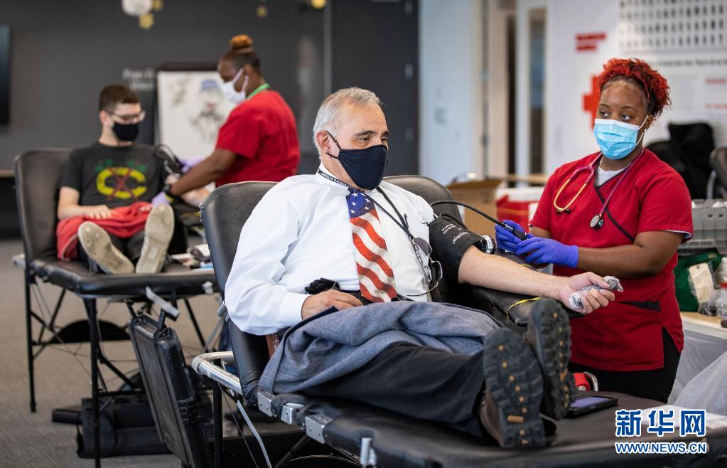 6月14日,在美國芝加哥,兩名獻血志愿者在大芝加哥地區(qū)紅十字會一獻血站內測量血壓。新華社發(fā)(喬爾·萊納攝)