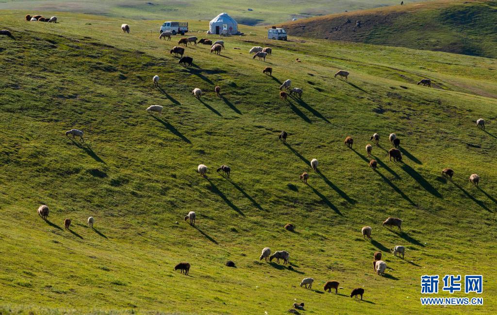 眼下,巴爾魯克山區(qū)的夏牧場迎來放牧黃金季。群山起伏,峰巒翠綠,氈房、牛羊等牲畜分散點綴其間,自駕游客時而穿梭往來,共同譜寫一曲高山夏季牧歌。