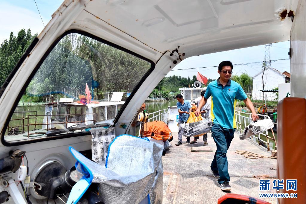 6月20日,在微山縣南陽(yáng)鎮(zhèn)南陽(yáng)碼頭,郵遞員王少朋從渡輪上搬卸郵件。南陽(yáng)鎮(zhèn)的郵件往來(lái)全靠船進(jìn)船出。