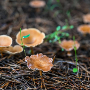 这是在内蒙古通辽市科尔沁左翼后旗的科尔沁沙地“双百万亩”综合治理工程努古斯台项目区内,樟子松林下生长的蘑菇(2024年8月3日摄)。新华社记者 连振 摄