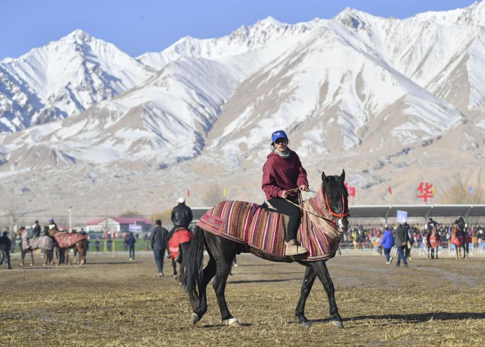古丽艾萨·迪汗骑马来到赛场。新华社记者 胡虎虎 摄