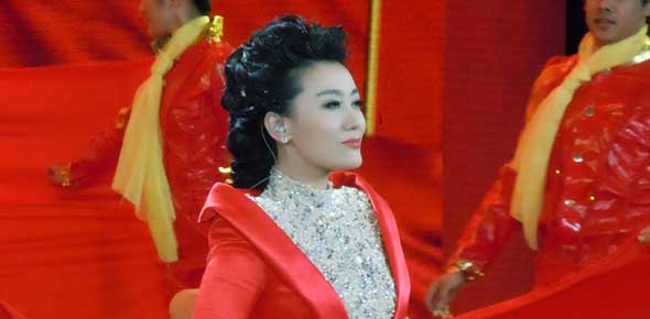 譚晶著中國(guó)紅長(zhǎng)裙獻(xiàn)唱