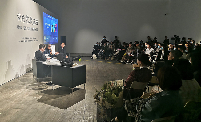 在美侖美術(shù)館·圣之空間的分享會(huì)上,徐冰就為什么要出版這本書(shū)、以及關(guān)于自己藝術(shù)創(chuàng)作的思想與方法開(kāi)啟發(fā)言;田霏宇就UCCA舉辦“徐冰:思想與方法”大展的價(jià)值選擇和影響力展開(kāi)回顧,以及身為策展人如何看待藝術(shù)家在展覽中的表現(xiàn),又如何看待藝術(shù)家出版物的水準(zhǔn)和價(jià)值等問(wèn)題展開(kāi)討論;孫華為大家分享了《徐冰:思想與方法》一書(shū)的編創(chuàng)與設(shè)計(jì)的故事,以及在運(yùn)用不同的方法構(gòu)建徐冰的展覽和畫(huà)冊(cè)獲得的啟示發(fā)表了自己的觀點(diǎn)。