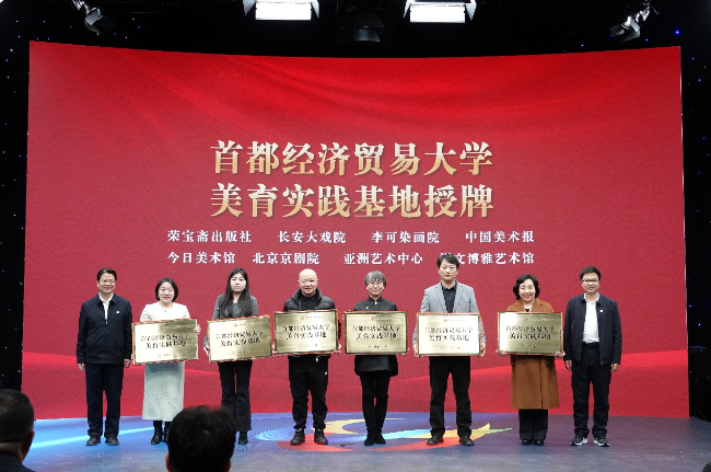 活动现场,首都经济贸易大学为长安大戏院、荣宝斋出版社、今日美术馆、中国美术报、李可染画院、亚洲艺术中心、北京京剧院、泓文博雅艺术馆等8家艺术机构授予“美育实践基地”牌匾。首批基地涵盖艺术机构、美术媒体、文化产业、非遗传承、舞台艺术等多个领域,未来将为学生提供艺术鉴赏、第二课堂、艺术传播、文创开发、非遗体验等多元化实践育人和实习岗位,同时联合开展特色课程开发、学术研究等合作,切实推动课堂教学与行业实践深度融合。
