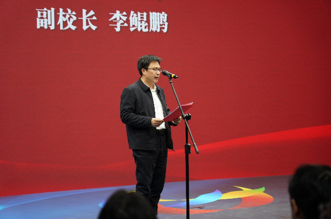 首都经济贸易大学副校长李鲲鹏在讲话中总结了近年来学校在“五育并举”人才培养中的成绩、经验,并代表学校宣布“首都经济贸易大学美育实践基地联盟”成立。