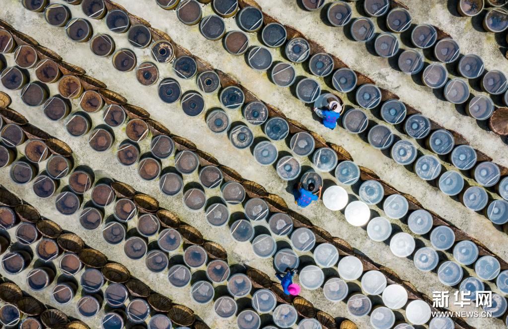7月10日,工人在畢節市金沙縣禹謨鎮泡木灣醬醋基地查看醬醋晾曬情況(無人機照片)。新華社發(范暉攝)