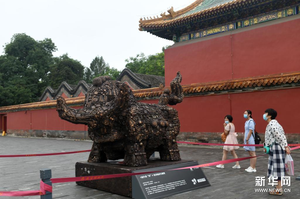 這是故宮內展出的《福牛辭“舊”》廢棄物再生雕塑(7月13日攝)。新華社記者 金良快 攝