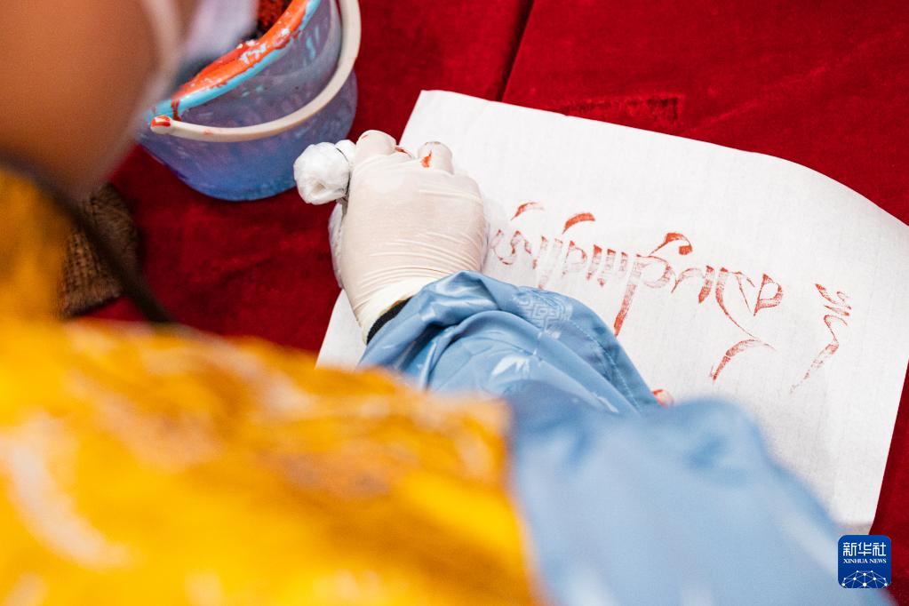 2月22日,西藏博物馆工作人员将刻有“扎西德勒”的木刻印刷在纸上。
