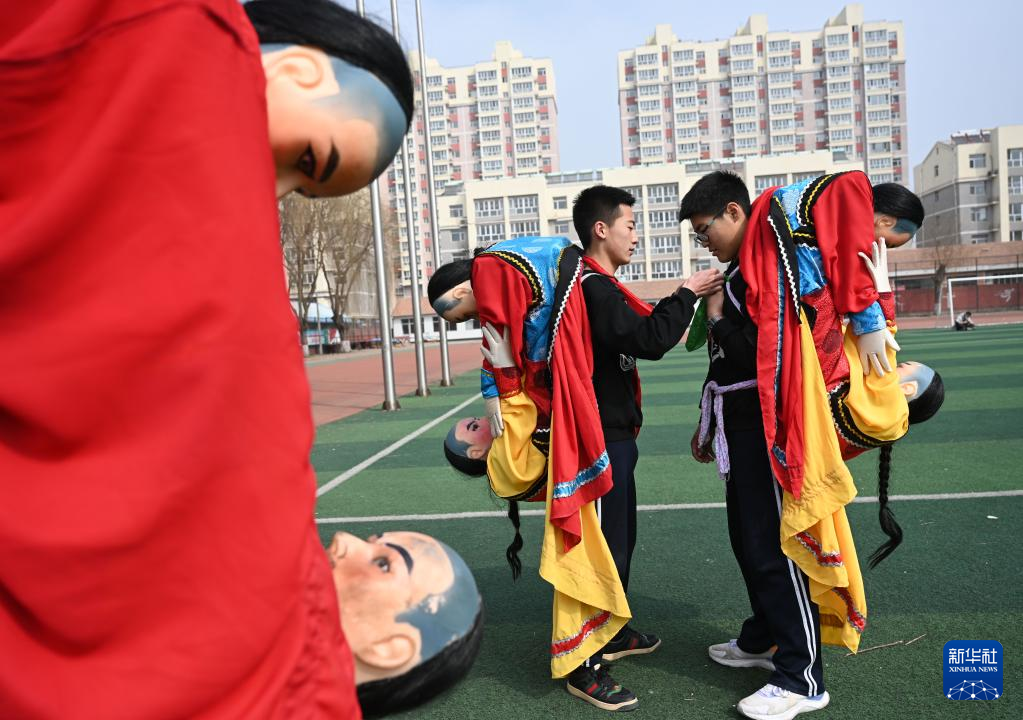 3月20日,隆化县职教中心学生在练习河北省级非遗项目“隆化中幡”。
