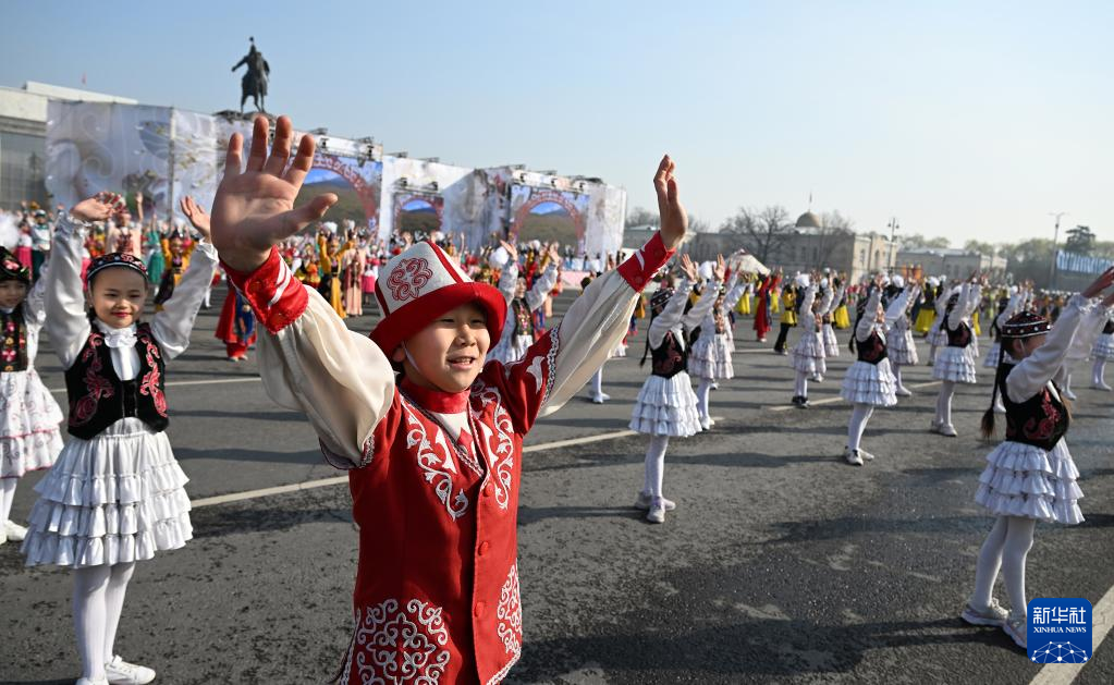 3月21日,人们在吉尔吉斯斯坦首都比什凯克阿拉套广场参加纳乌鲁斯节庆典表演。
