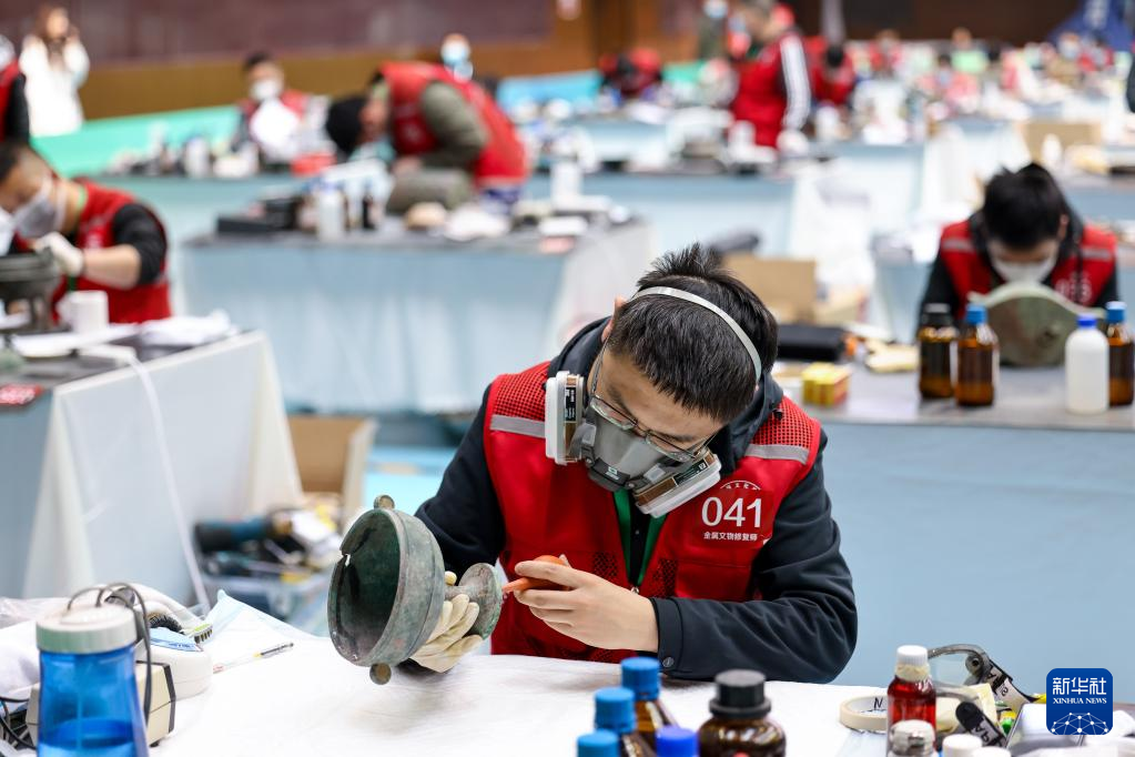参加金属文物修复师比赛项目的选手在现场进行文物修复(3月25日摄)。