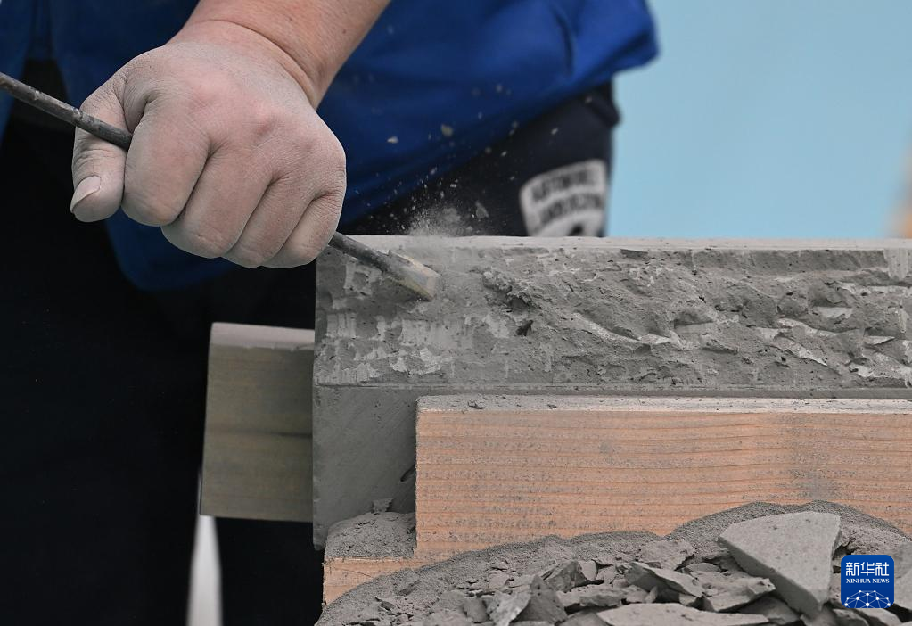 一位参加泥瓦作文物修复师比赛项目的选手运用传统技术进行建筑材料的加工(3月25日摄)。