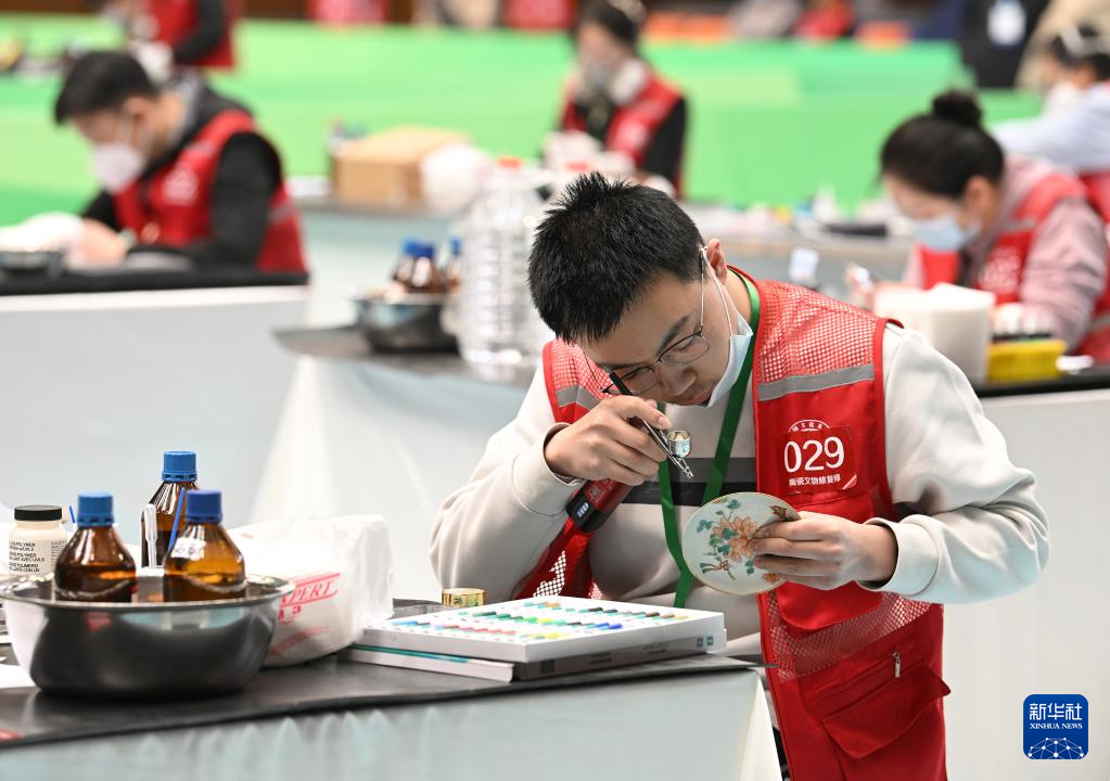 参加陶瓷文物修复师比赛项目的选手在现场进行文物修复(3月25日摄)。