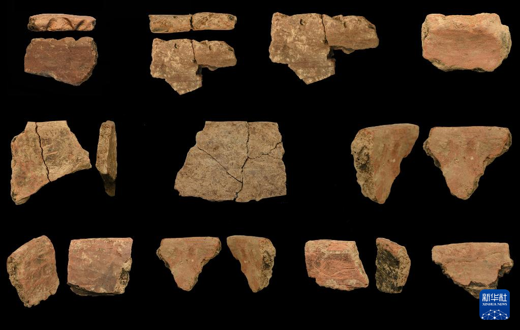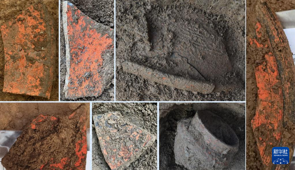 河南偃师二里头都邑西北部出土的带漆陶片(资料拼版照片)。