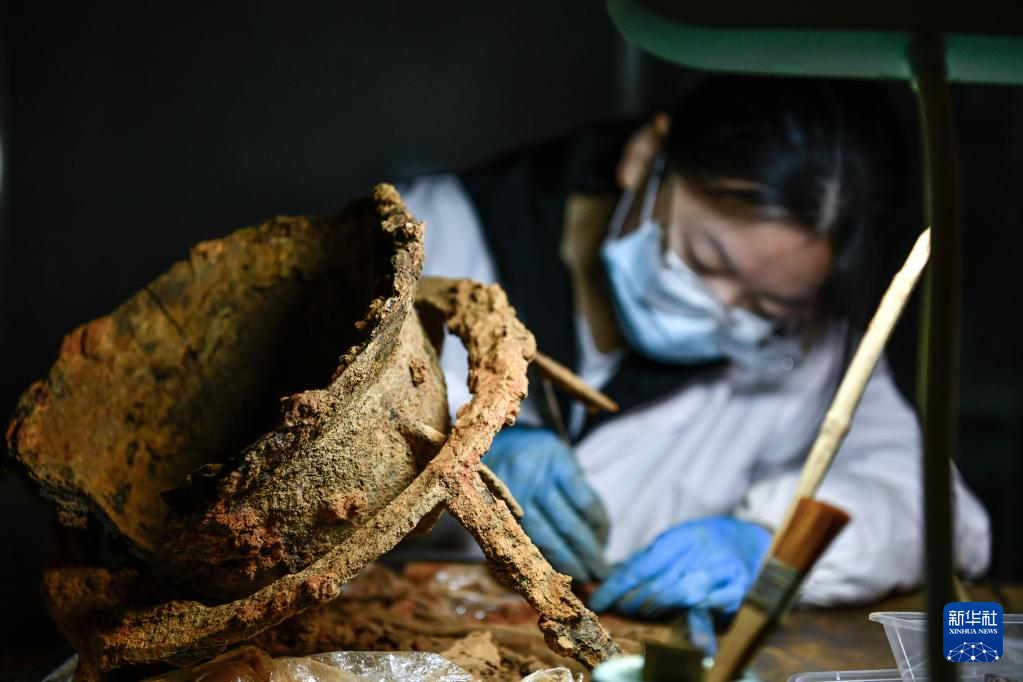 3月30日,在贵州贵安新区大松山墓群文物临时库房,文物保护专业的学生在清理出土的铁器类文物。