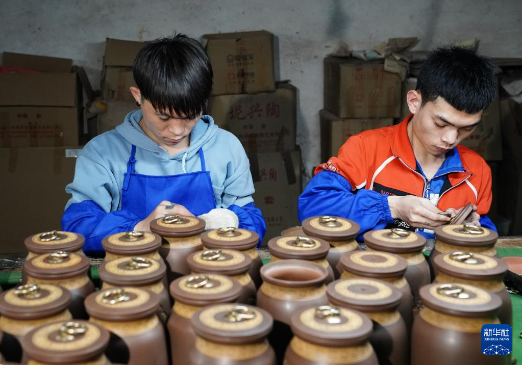 4月11日,在广西钦州市,员工在坭兴陶生产车间进行拼接工作。