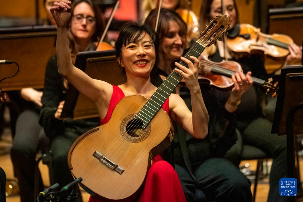 4月13日,中国古典吉他演奏家杨雪霏(前)在英国伦敦举行的“东西之间”交响音乐会上演出。新华社发(史蒂芬·程摄)