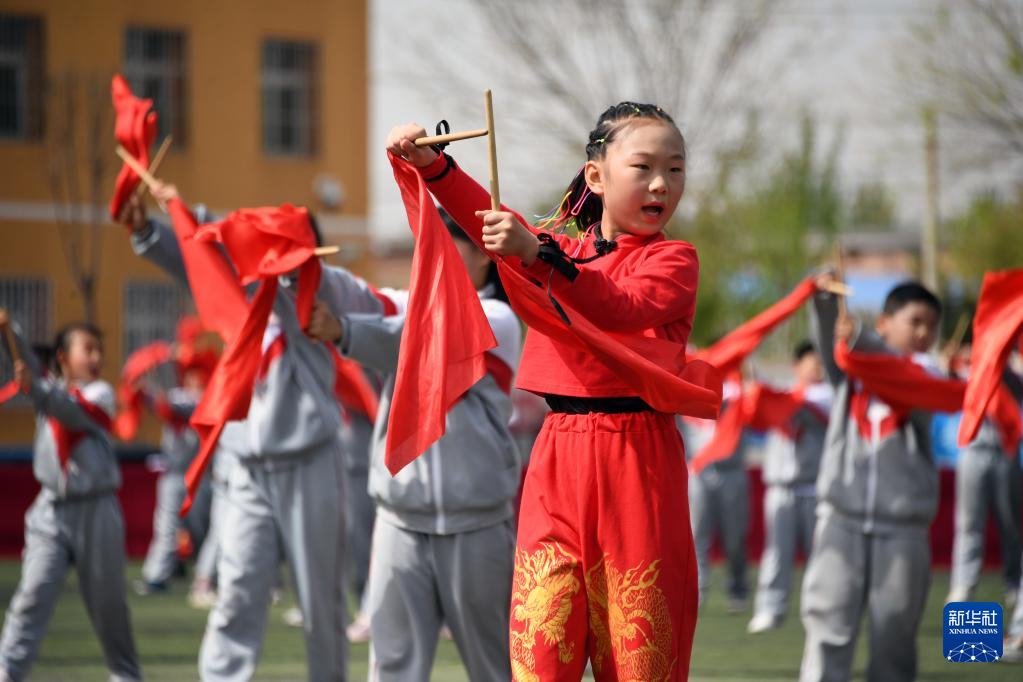 4月19日,门楼中心小学的学生在活动中进行鼓舞表演。