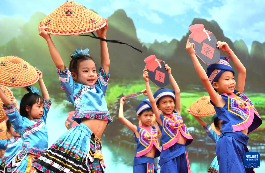 4月20日,孩子们在广西南宁市逸夫小学表演民族舞蹈。