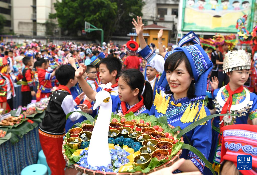 当日,广西南宁市逸夫小学举行2023“壮族三月三”暨“铸牢中华民族共同体意识”主题教育活动。色彩缤纷的民族服装,民族风情浓郁的歌舞表演,多种多样的特色美食,让校园处处洋溢着欢乐。随着传统节日“壮族三月三”临近,广西各地陆续开展丰富多彩的庆祝活动。