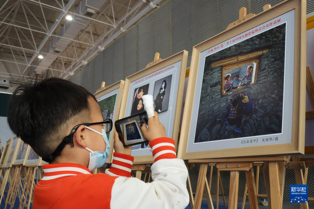 4月23日,小朋友在展览现场拍摄展出的摄影作品。