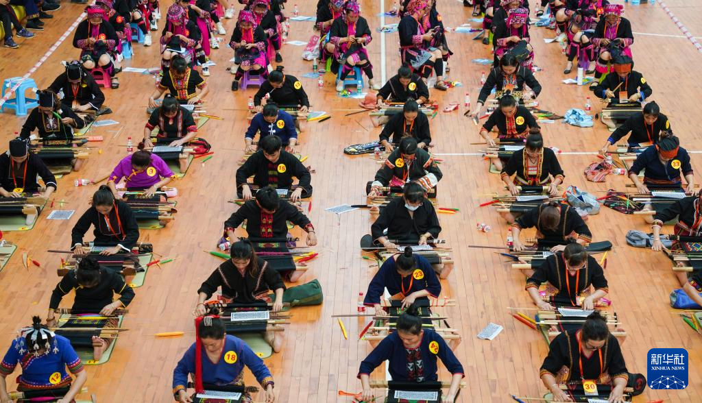 4月23日在海南省乐东黎族自治县拍摄的黎锦苗绣技艺比赛现场。