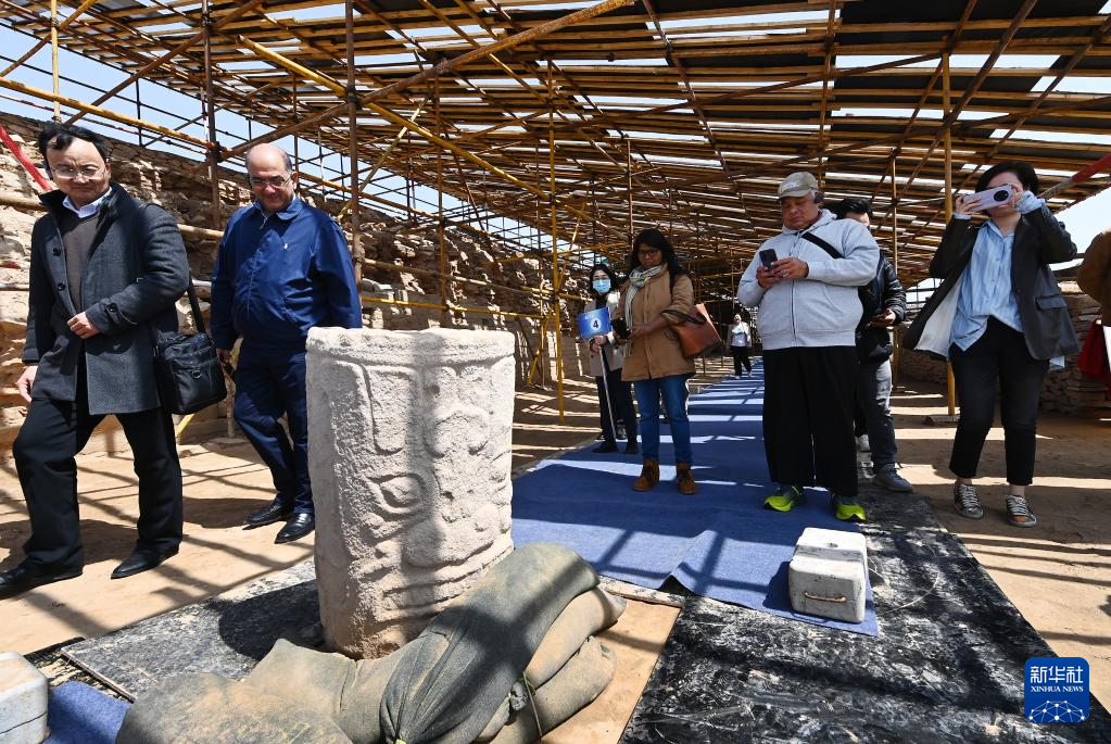 4月26日,外宾在陕西石峁遗址文物医院展厅参观调研。