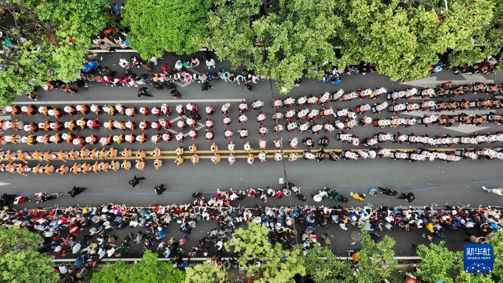 5月2日,人们在贵州省台江县参加苗族姊妹节盛装巡游(无人机照片)。