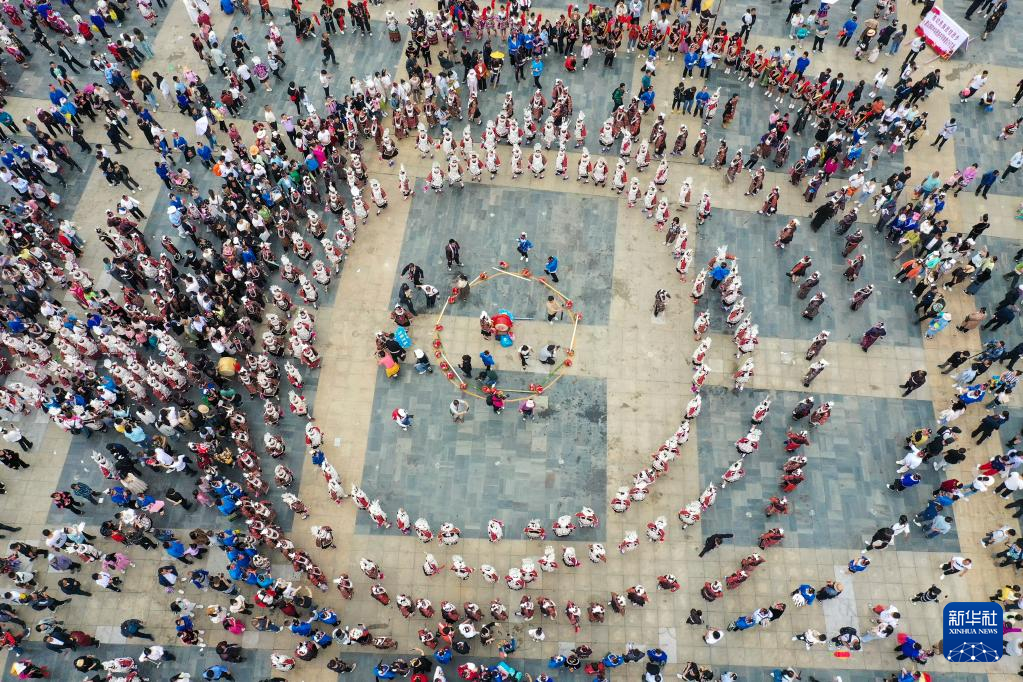 5月2日,人们在贵州省台江县姊妹广场参加苗族姊妹节盛装活动(无人机照片)。