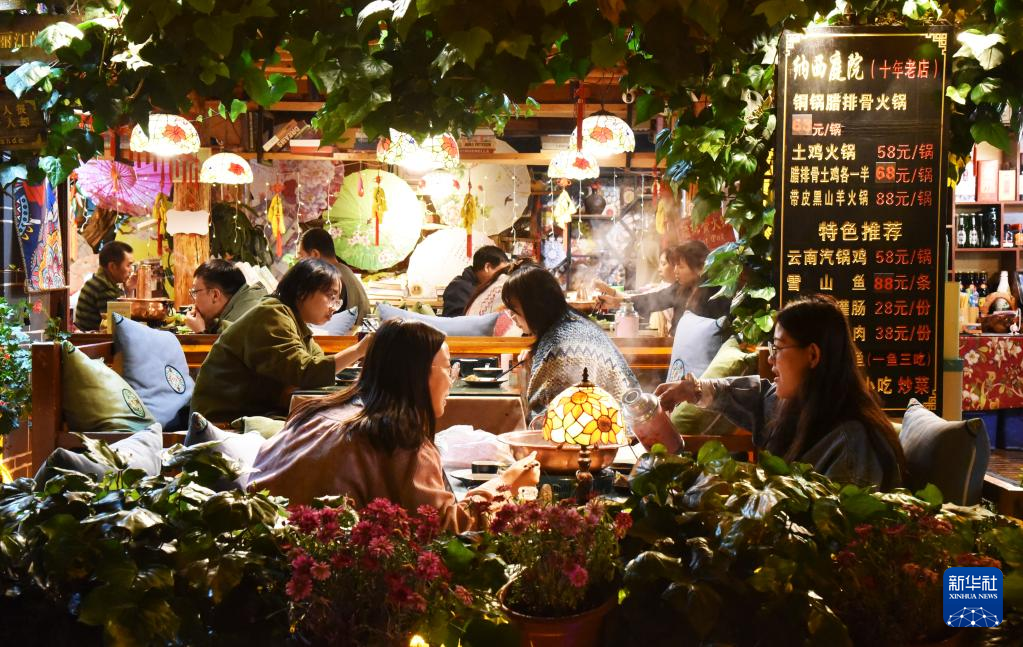 5月2日晚,游人在云南丽江古城享受美食。新华社发(赵庆祖 摄)
