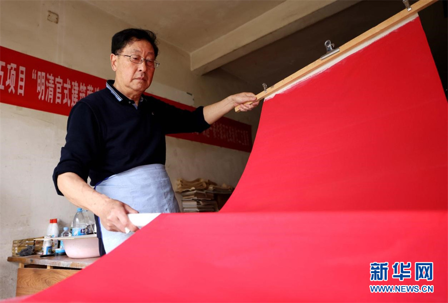近日,宫廷描金纸省级非遗传承人范发生在工作室进行纸张染色。