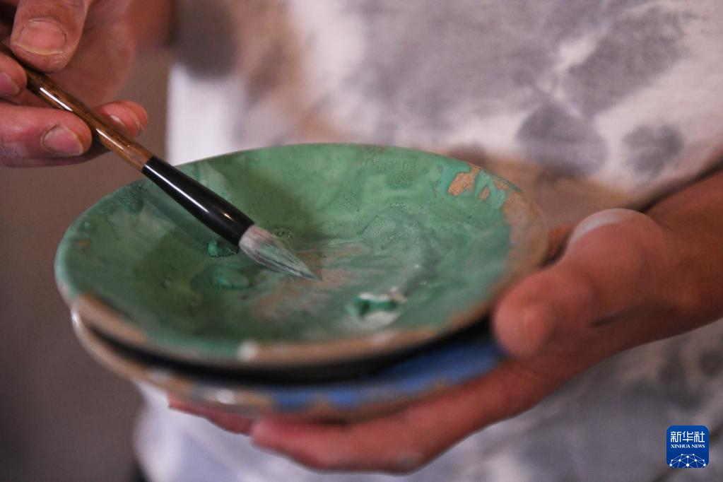 5月11日,学员在位于敦煌市的莫高里工匠村用天然矿石制作颜料。