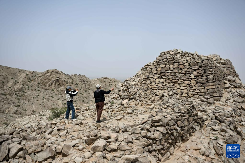 5月13日,驼峰(长城)文物保护队员许继龙(右)和乌仁其其格在巡查阿拉善左旗一处石圈遗址。