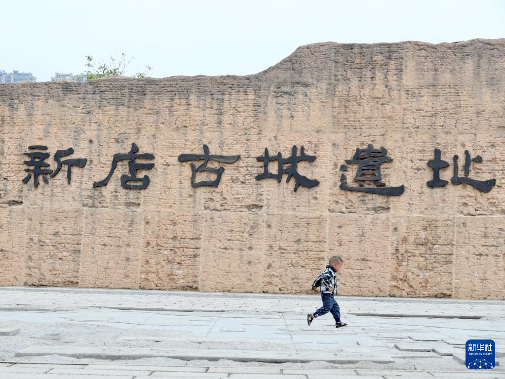 孩子在福州新店古城遗址公园城墙前玩耍(5月16日摄)。