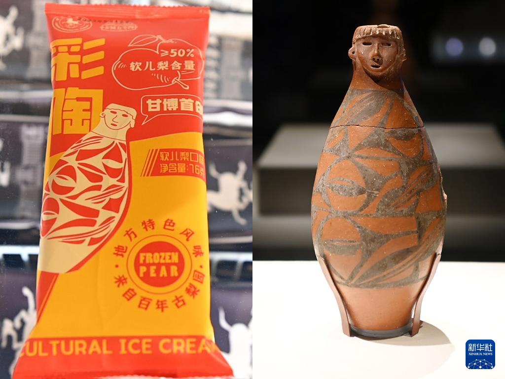 拼版照片:左图为彩陶软儿梨雪糕(5月18日摄);右图为甘肃省博物馆展出的人头形器口彩陶瓶(5月18日摄)。