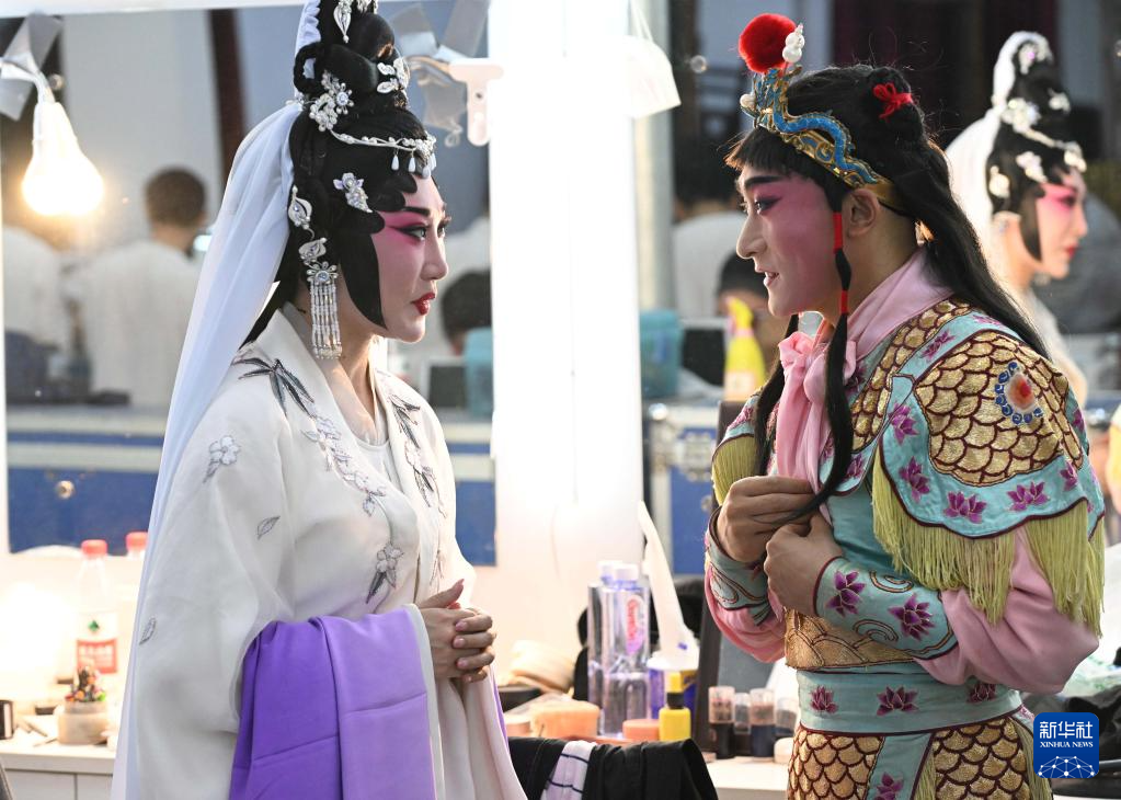 5月29日,刚获得第31届中国戏剧梅花奖的广州粤剧院演员李嘉宜(左)与河北省河北梆子剧院演员郝士超(右)在后台交流。