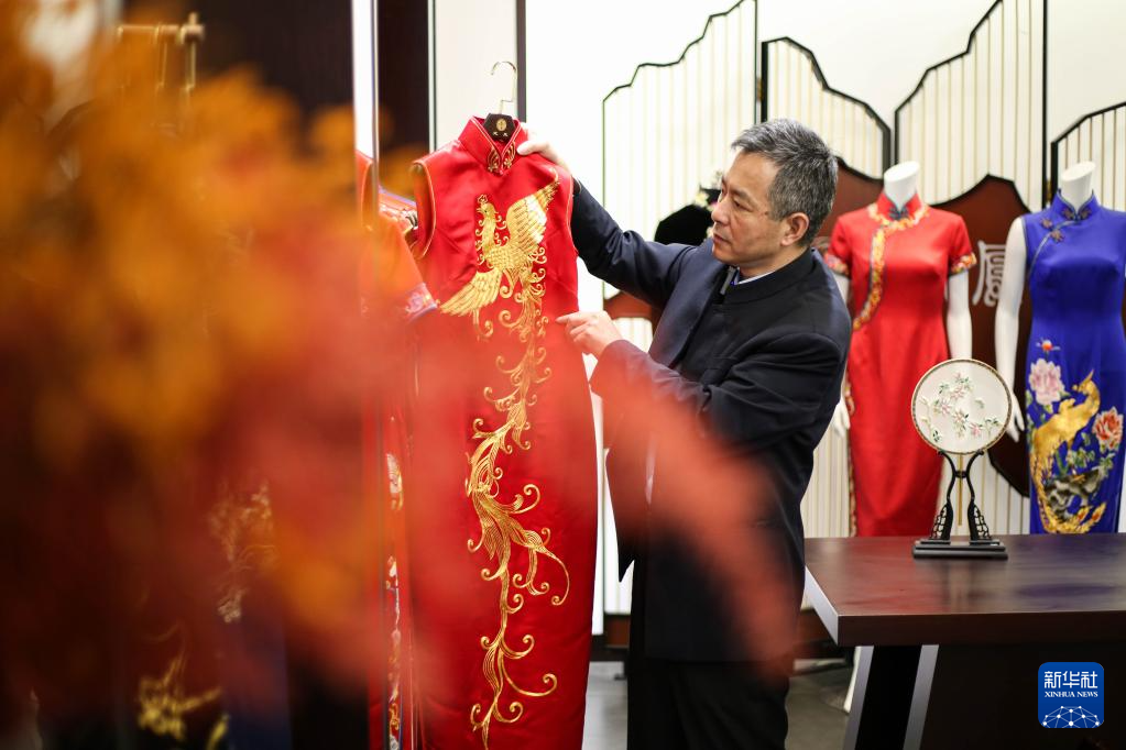 江满宗出生于1966年,是“龙凤旗袍手工制作技艺”第四代传承人和传播者。他曾多次带领徒弟走进社区、学校等地,代表企业参加大型展会,培养年轻人对旗袍文化的兴趣,向海内外观众展示龙凤旗袍的魅力。如今,他的两位徒弟张钦玮和吴雨婷已成为“龙凤旗袍”技艺的第五代传承人。