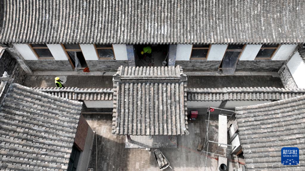 6月7日,施工人员在河北省石家庄市井陉县天长宋古城内的皆山书院进行古建筑修缮(无人机照片)。