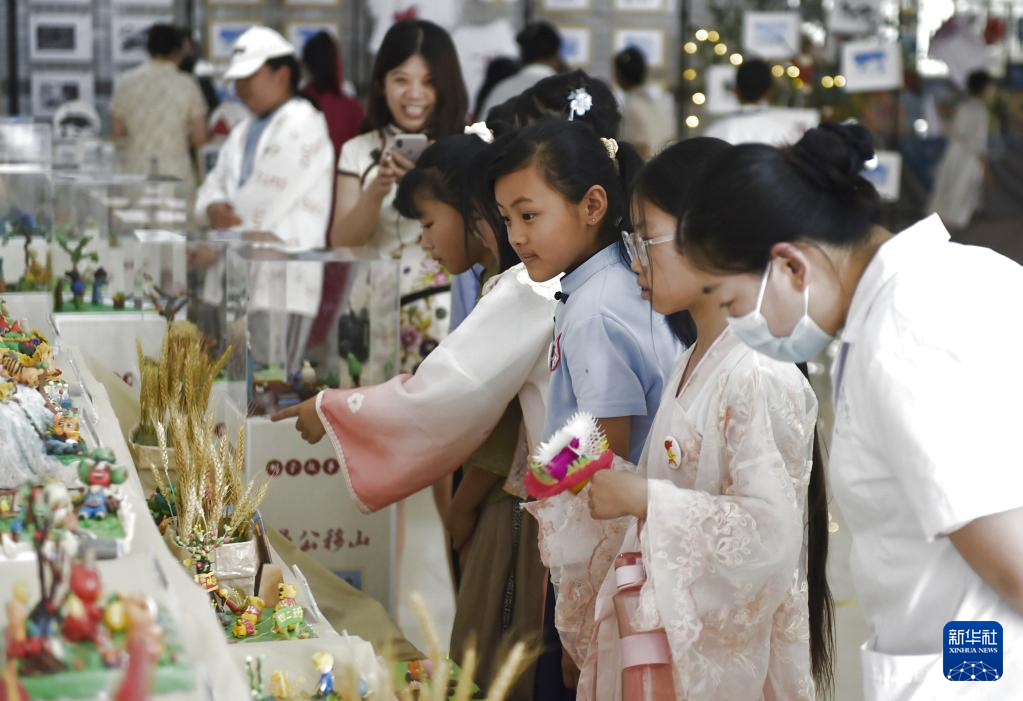 6月8日,学生们在活动现场参观展出的非遗作品。