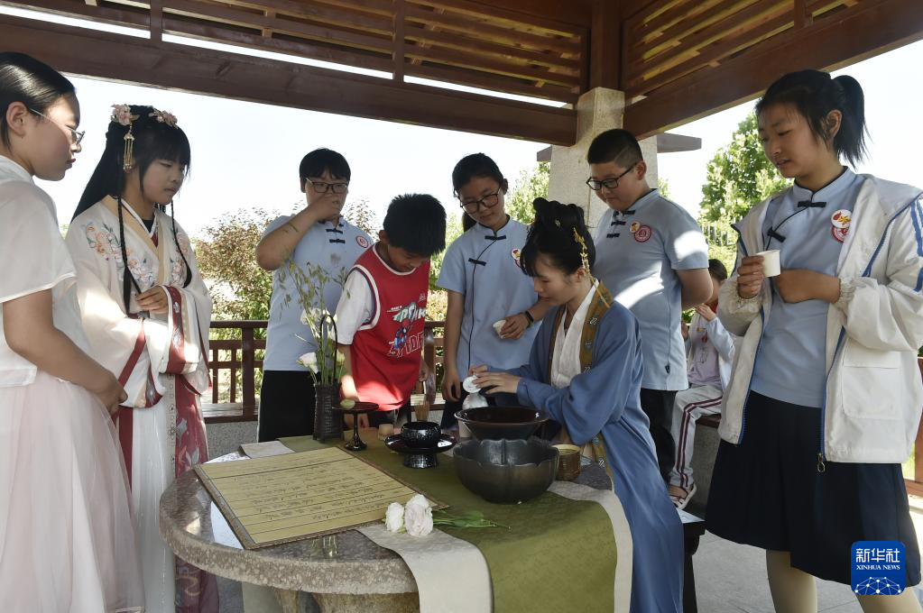 6月8日,学生们在活动现场观赏传统茶艺展演。