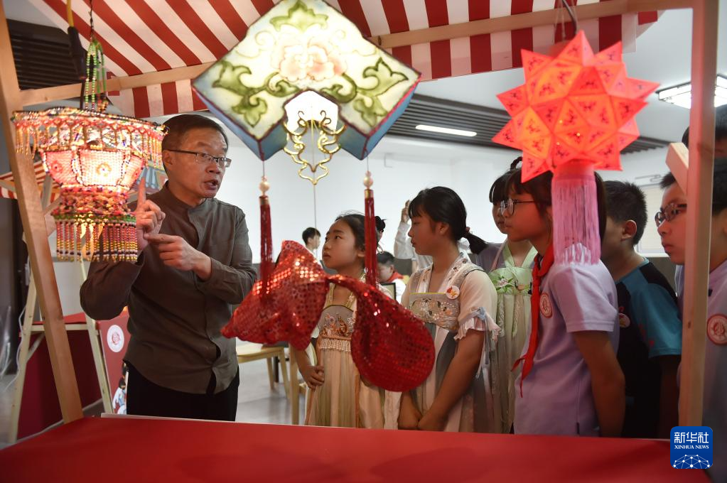 6月8日,学生们在活动现场观赏非遗项目“汴京灯笼张”的彩灯作品。